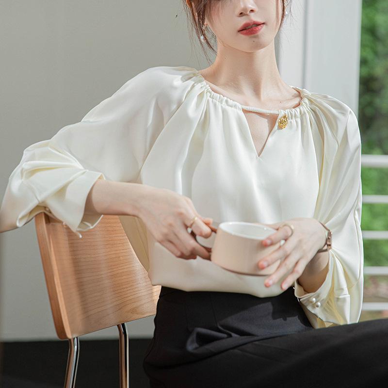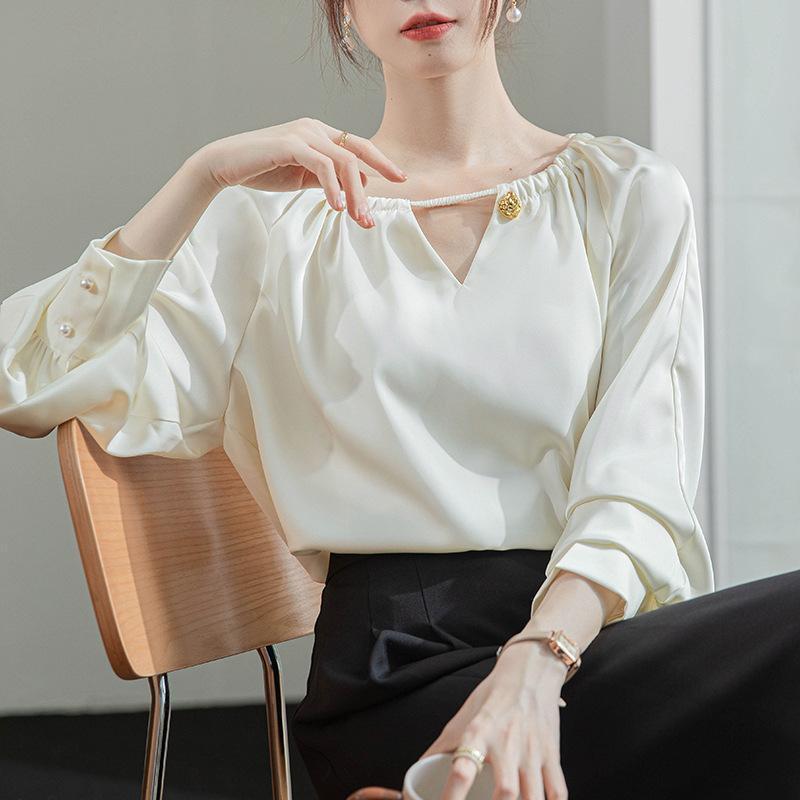 上質感 滑らか素材 通勤 通学 オフィス着 司会 お出かけ Vネック ゆったりパフスリーブシャツブラウス