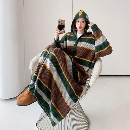 大きいサイズ レディース ニット ワンピース ロング パーカー 春 秋冬 新品 長袖 フード付き ボーダー