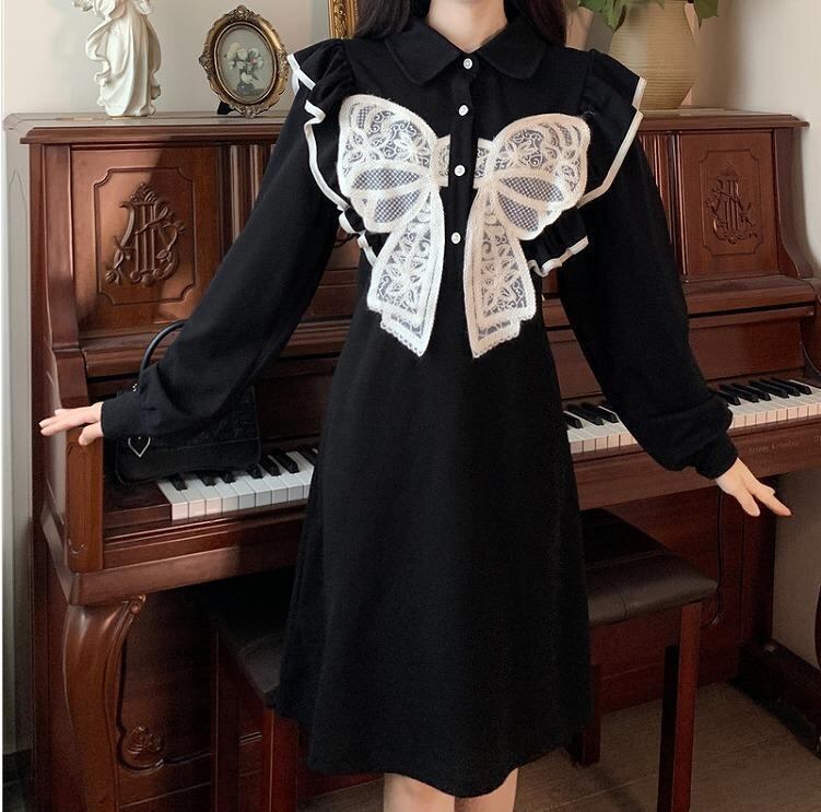 大きいサイズ レディース ワンピース リボン フリル 春 秋冬 新品 長袖 襟付き ガーリー