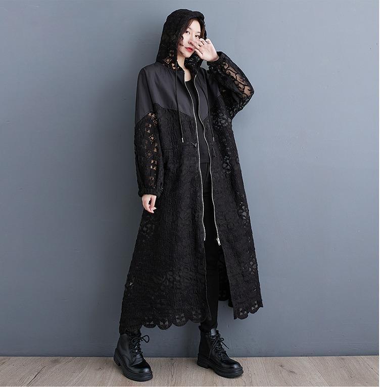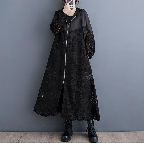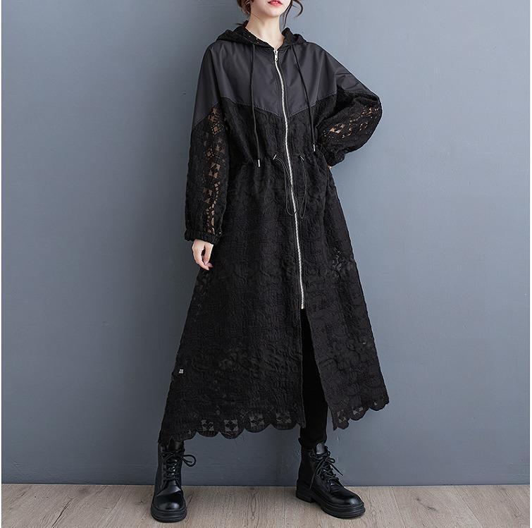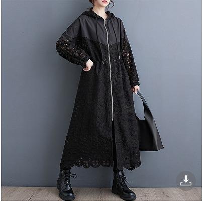大きいサイズ レディース コート アウター レース 春 秋冬 新品 長袖 パーカー フード ブラック
