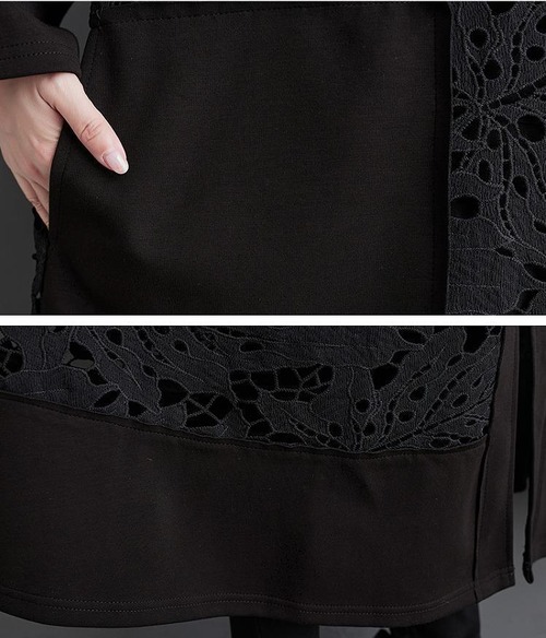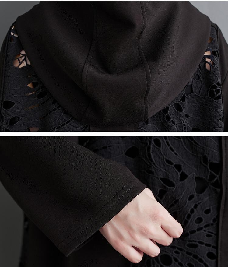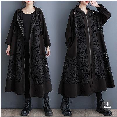 大きいサイズ レディース ロングコート レース パーカー 春 秋冬 新品 長袖 フード アウター ブラック ジップ