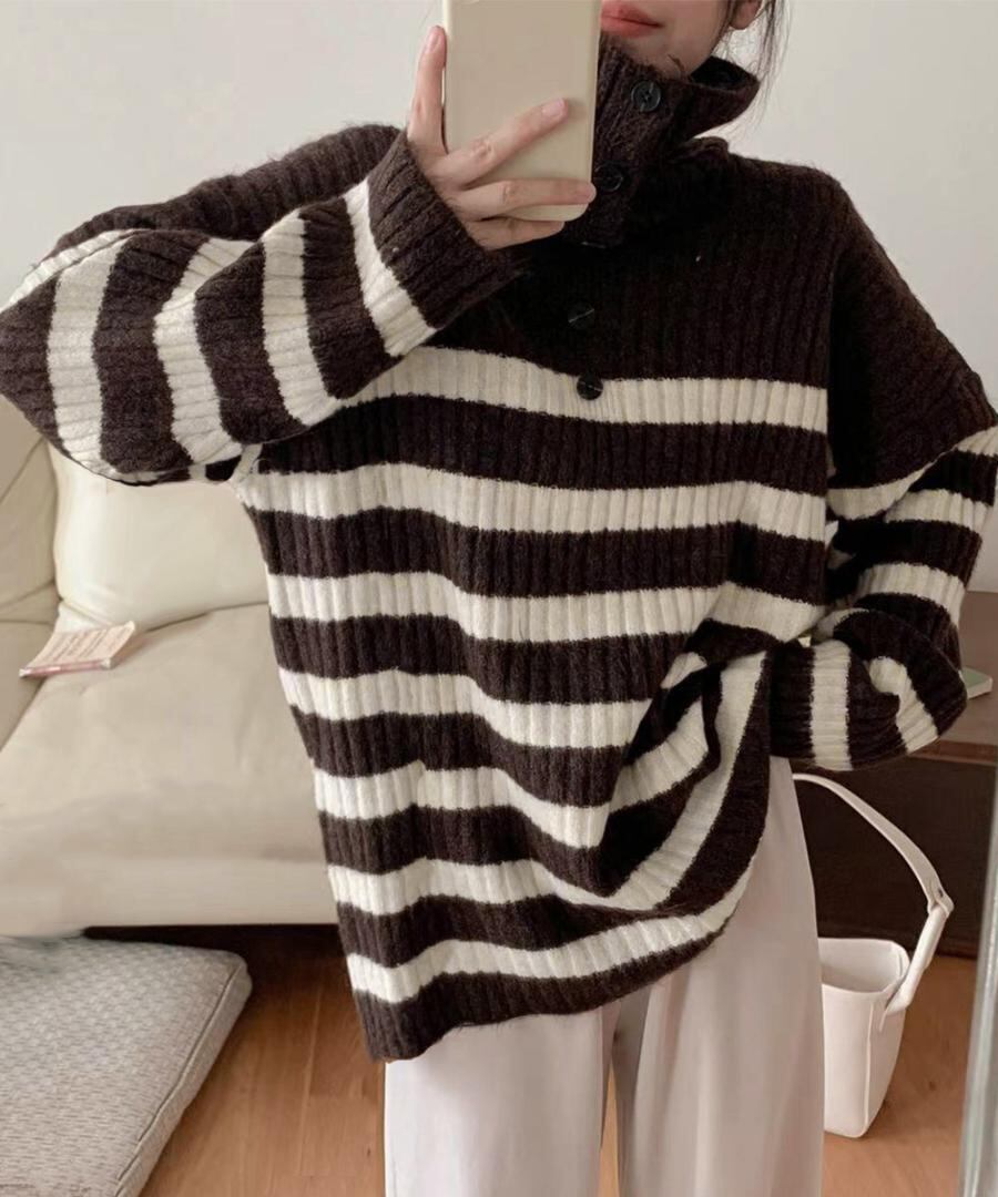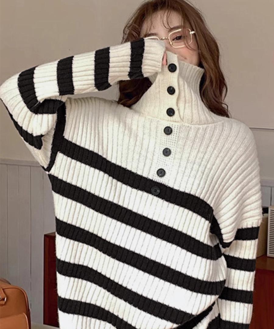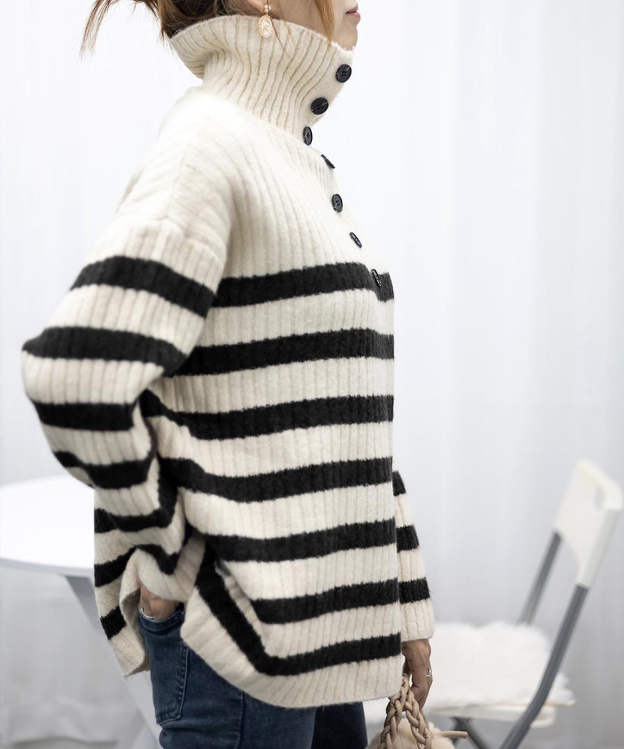 ハイネック仕様は優しくてエレガントな印象、小顔魅せも期待できる秋冬定番のボーダー柄ニットトップス