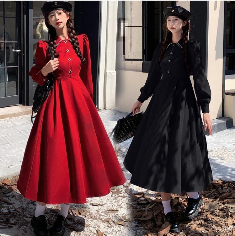 【大きいサイズ有】レディース ロング ワンピース 春 秋冬 新品 長袖 レッド