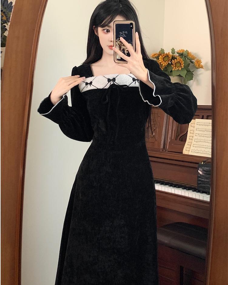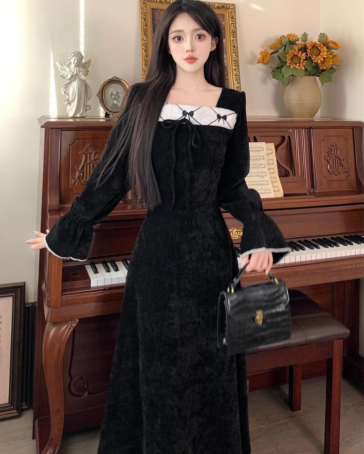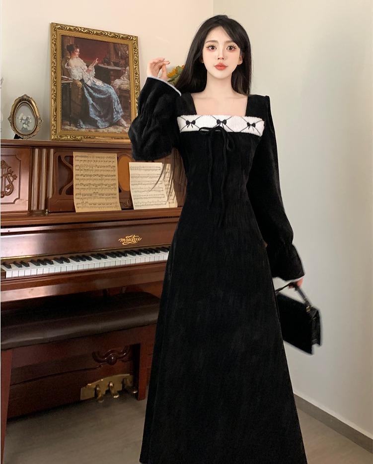 【大きいサイズ有】 レディース ワンピース ブラック 春 秋冬 新品 長袖 スクエアネック