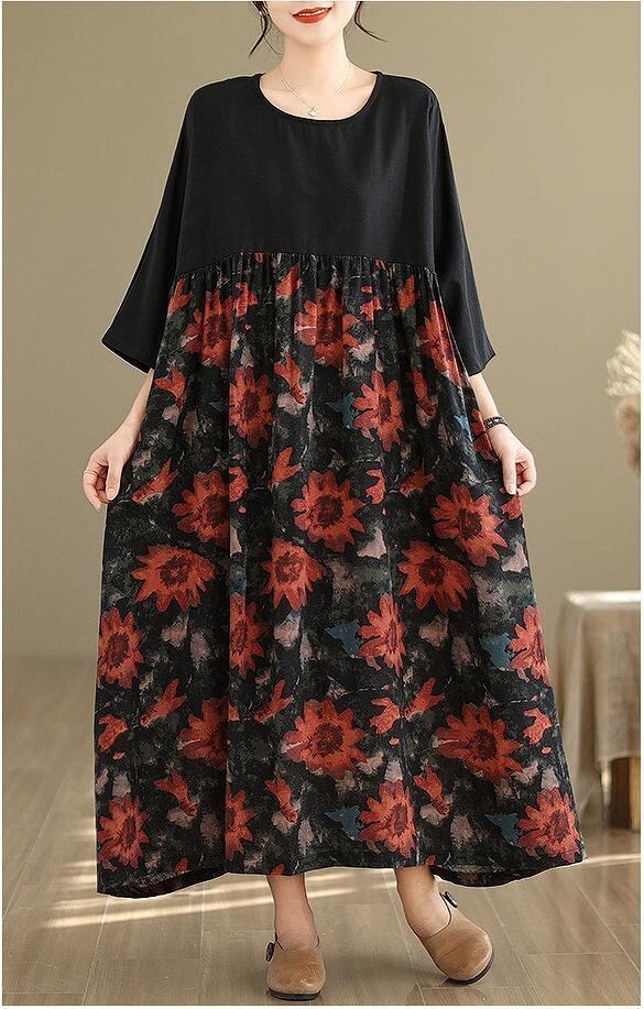 【大きいサイズ】 レディース ロング ワンピース 春夏 秋 新品 五分袖 半袖 花柄 ゆったり