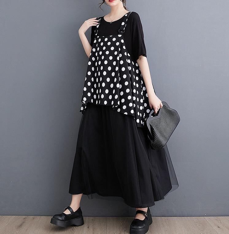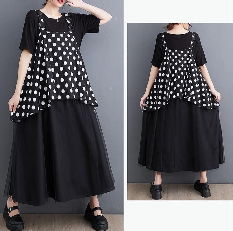 大きいサイズ レディース サロペット ワンピース ドット 春夏 秋 新品 重ね着風 袖なし