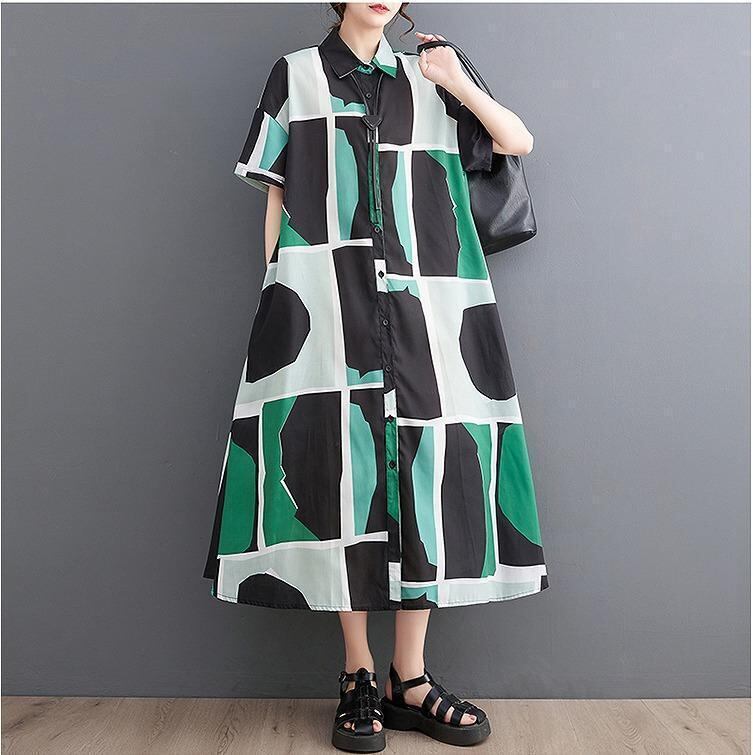 大きいサイズ レディース ロング ワンピース 春夏 秋 新品 半袖 シャツ グリーン