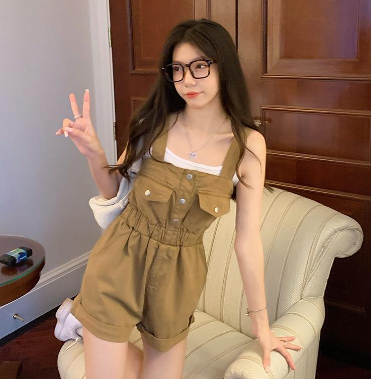 「新品 サロペット ショートオールインワン ブラウン 春夏 カジュアル」