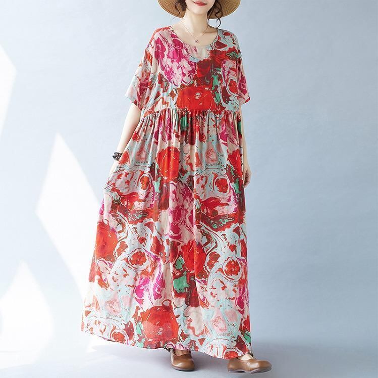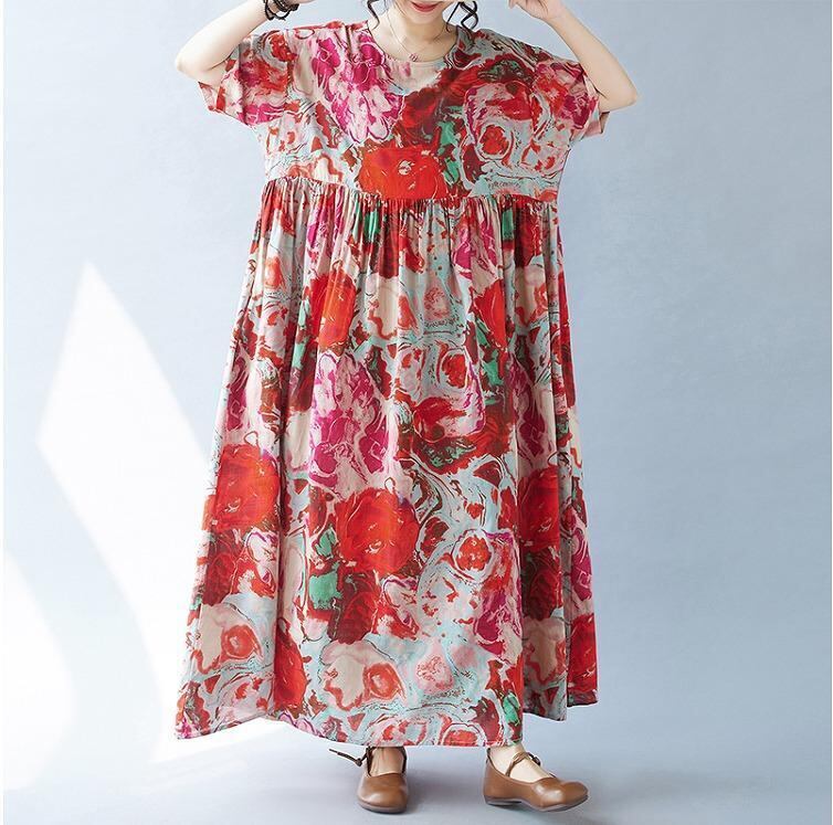 大きいサイズ レディース ロング ワンピース 春夏 秋 新品 半袖 レッド