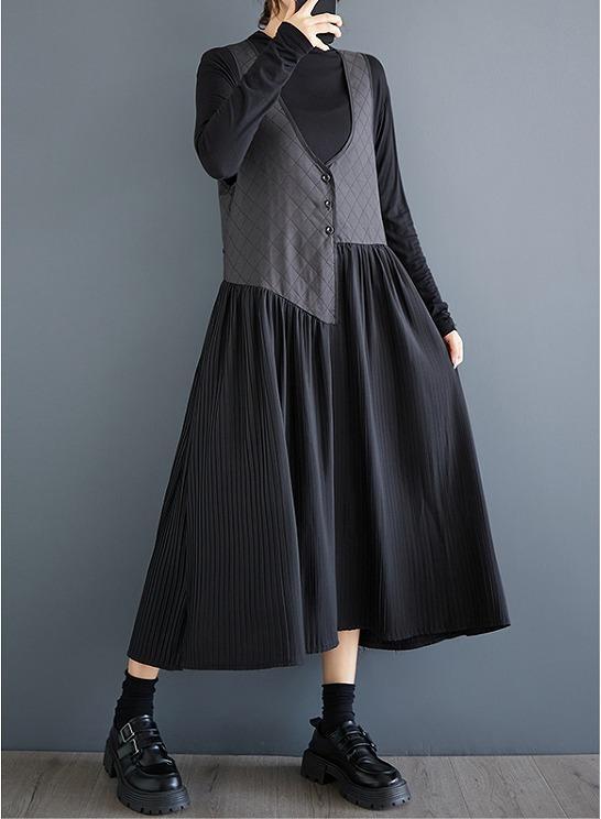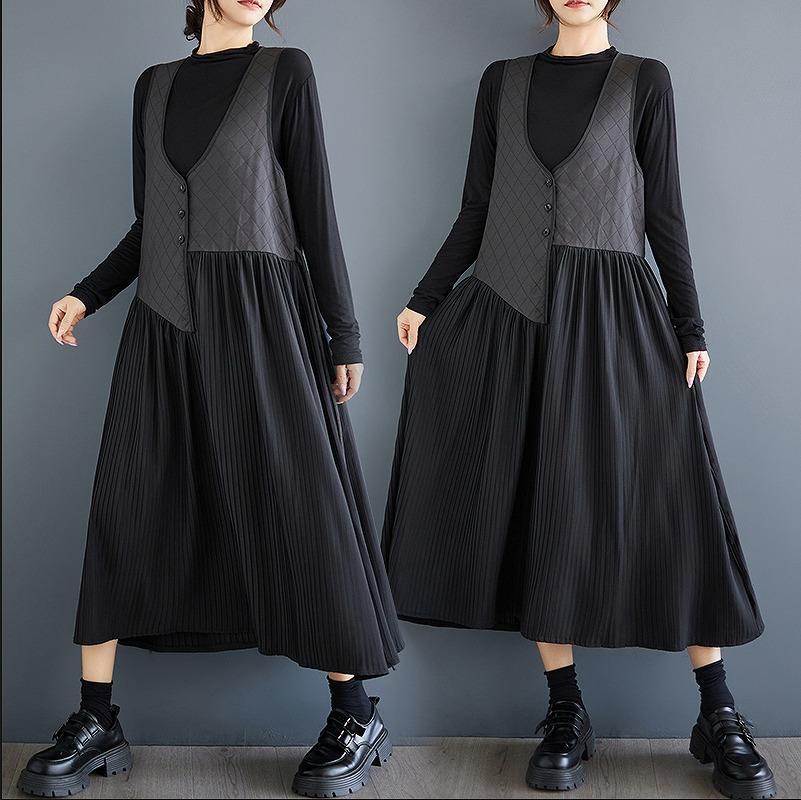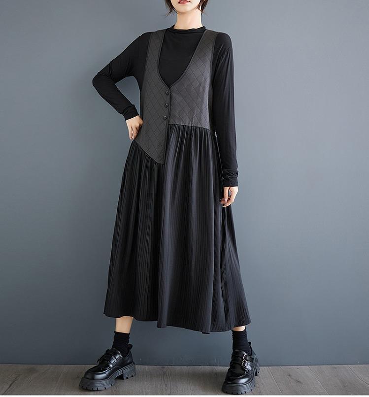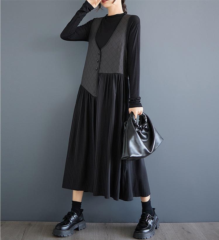 大きいサイズ ワンピース レイヤード レディース 異素材 秋冬 春 長袖 新品 ブラック イレギュラー ロング ミモレ