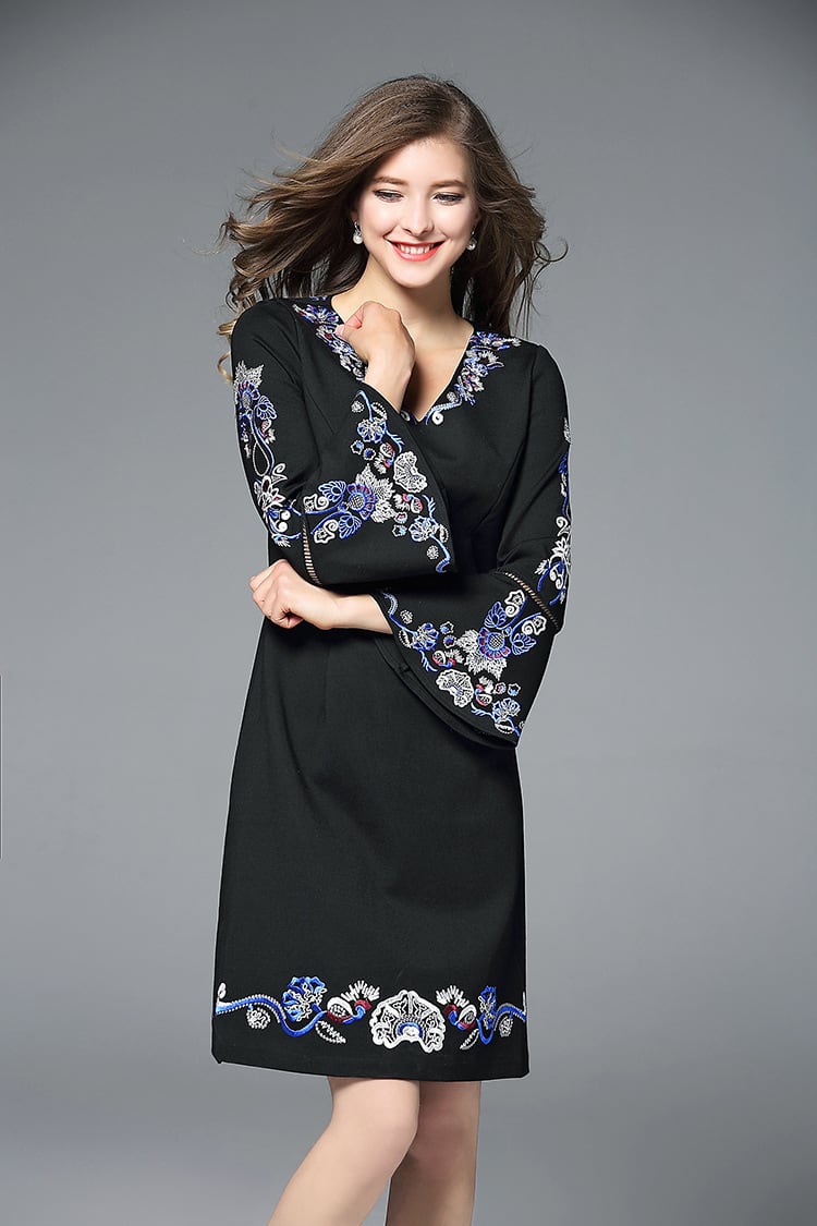 ネックや、袖、裾に施された花柄刺繍が上品感を与えられます!今年風の広がりフリルタイプの袖が可愛い!
