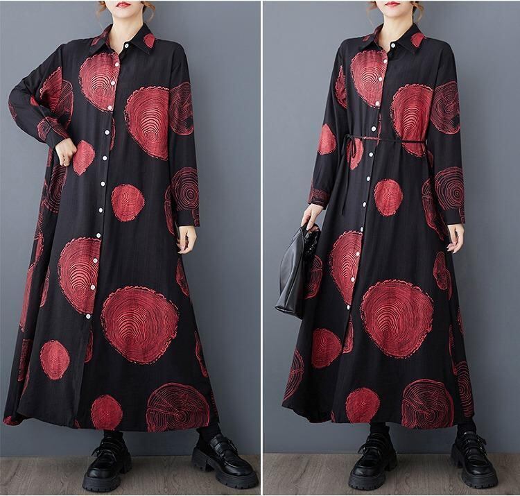 大きいサイズ ワンピース ロング ドット レディース 秋冬 春 新品 長袖 レッド シャツ
