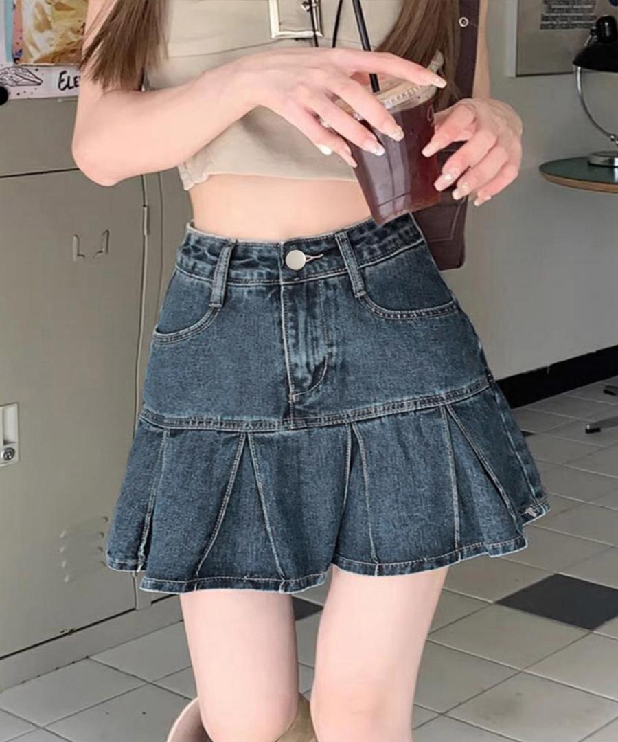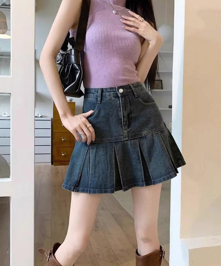 裾にプリーツが施された、ハイウエストでスタイルアップこうかのあるデニムスカート