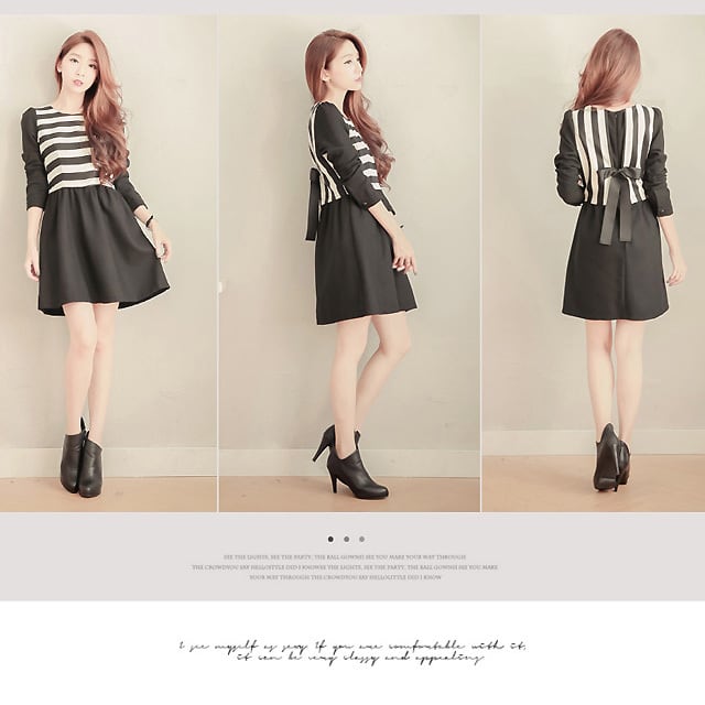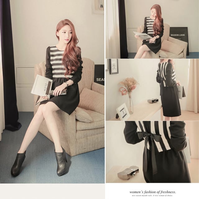 大きいサイズ レディース ボーダー&ストライプバックリボンワンピース 春夏