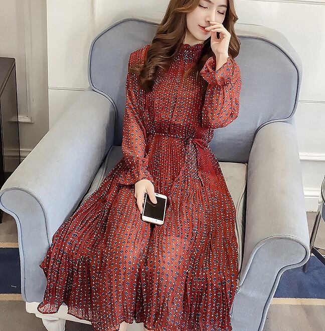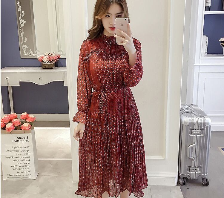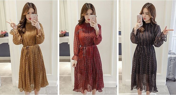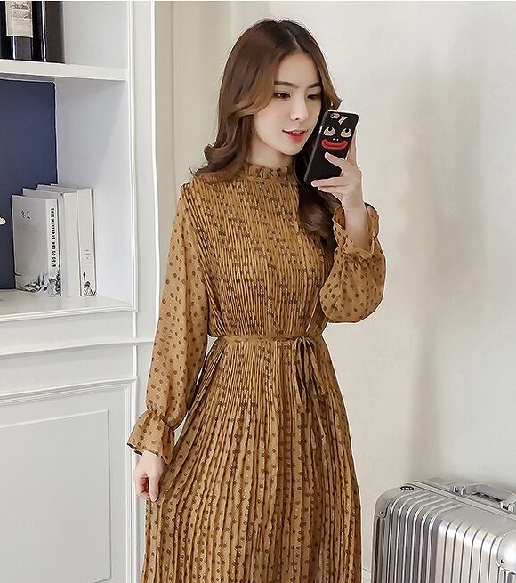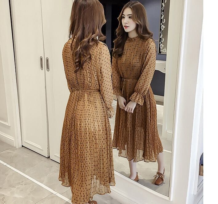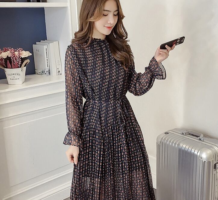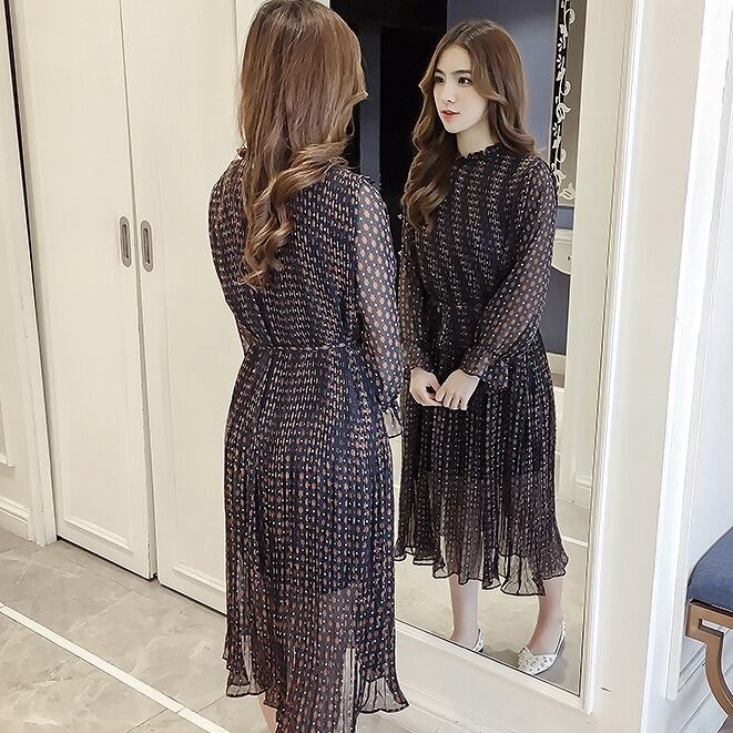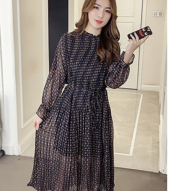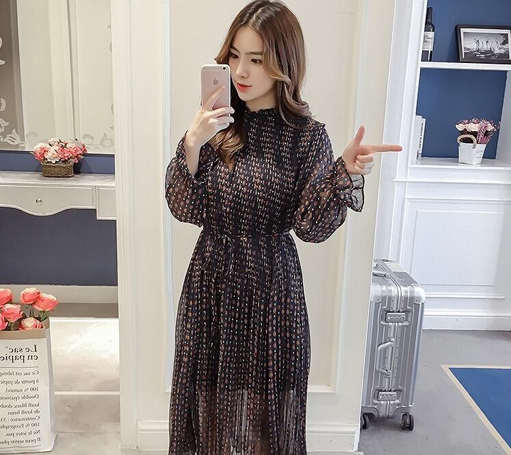 大きいサイズ レディース スタンドフリル透けワンピース レトロ 長袖 春夏