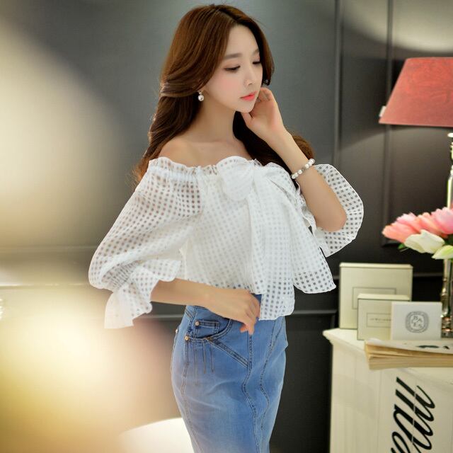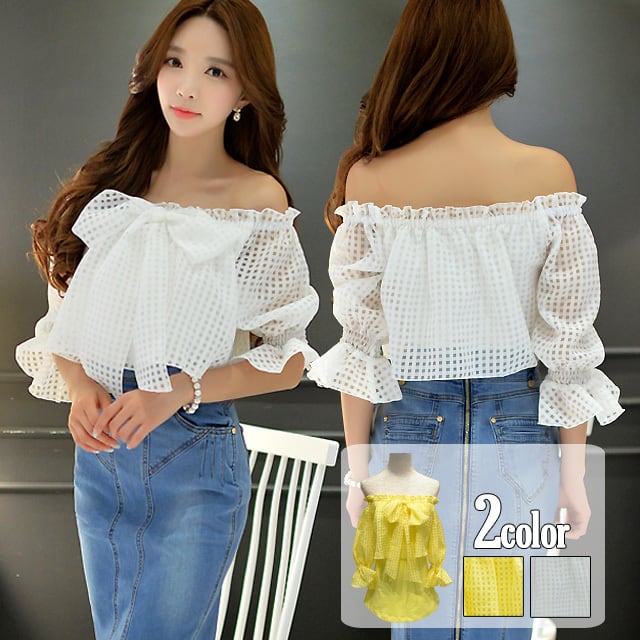 大きいサイズ レディース 透けチェック柄オフショルダーリボントップス 春夏 オフショル 肩出し